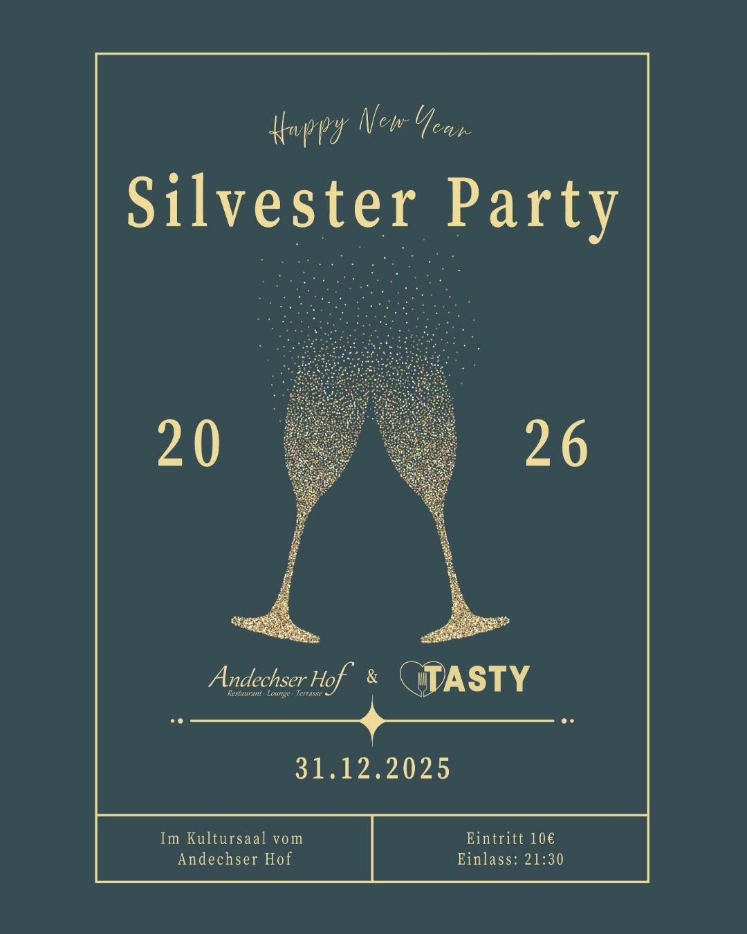 Der Andechser Hof lädt gemeinsam mit dem Tasty Bar & Restaurant zur Sylvester Party im Kultur Saal ein! Genießt eine unvergessliche Nacht mit guter Musik, prickelnden Drinks und einem spektakulären Feuerwerk.